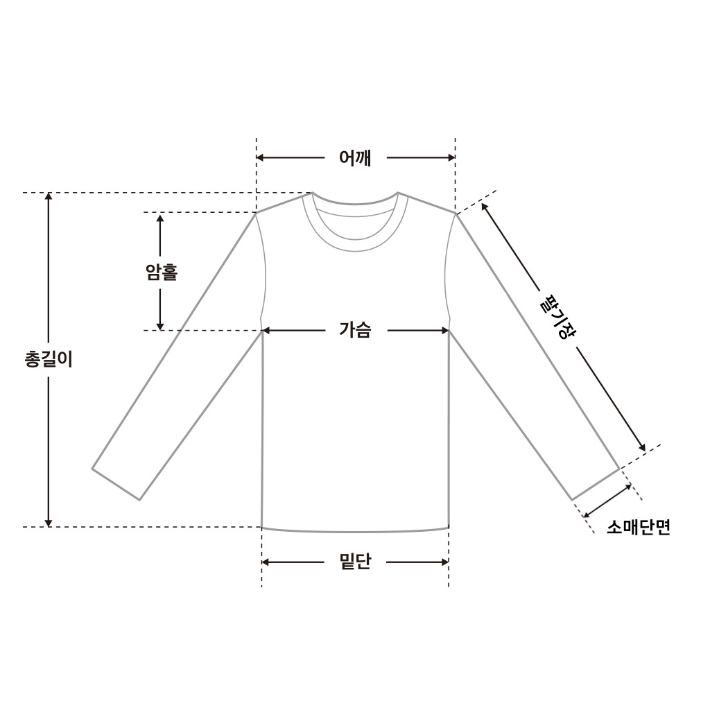 | 가슴단면 | 어깨단면 | 팔기장 | 암홀단면 | 소매단면 | 밑단단면 | 총길이 |