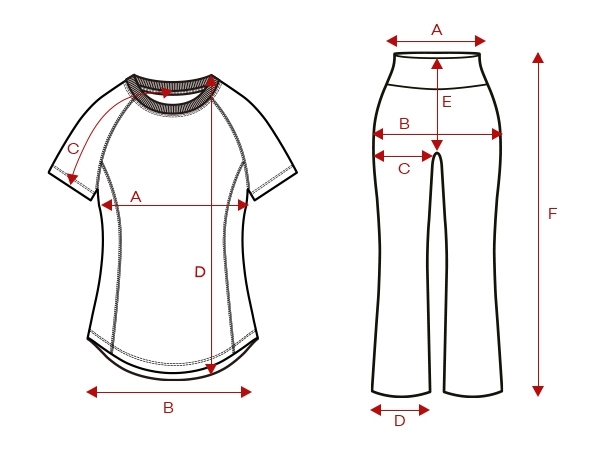 | SIZE | 하의 허리 A | 하의 엉덩이 B | 하의 허벅지 C | 하의 밑단 D | 하의 밑위 E | 하의 총장 F |